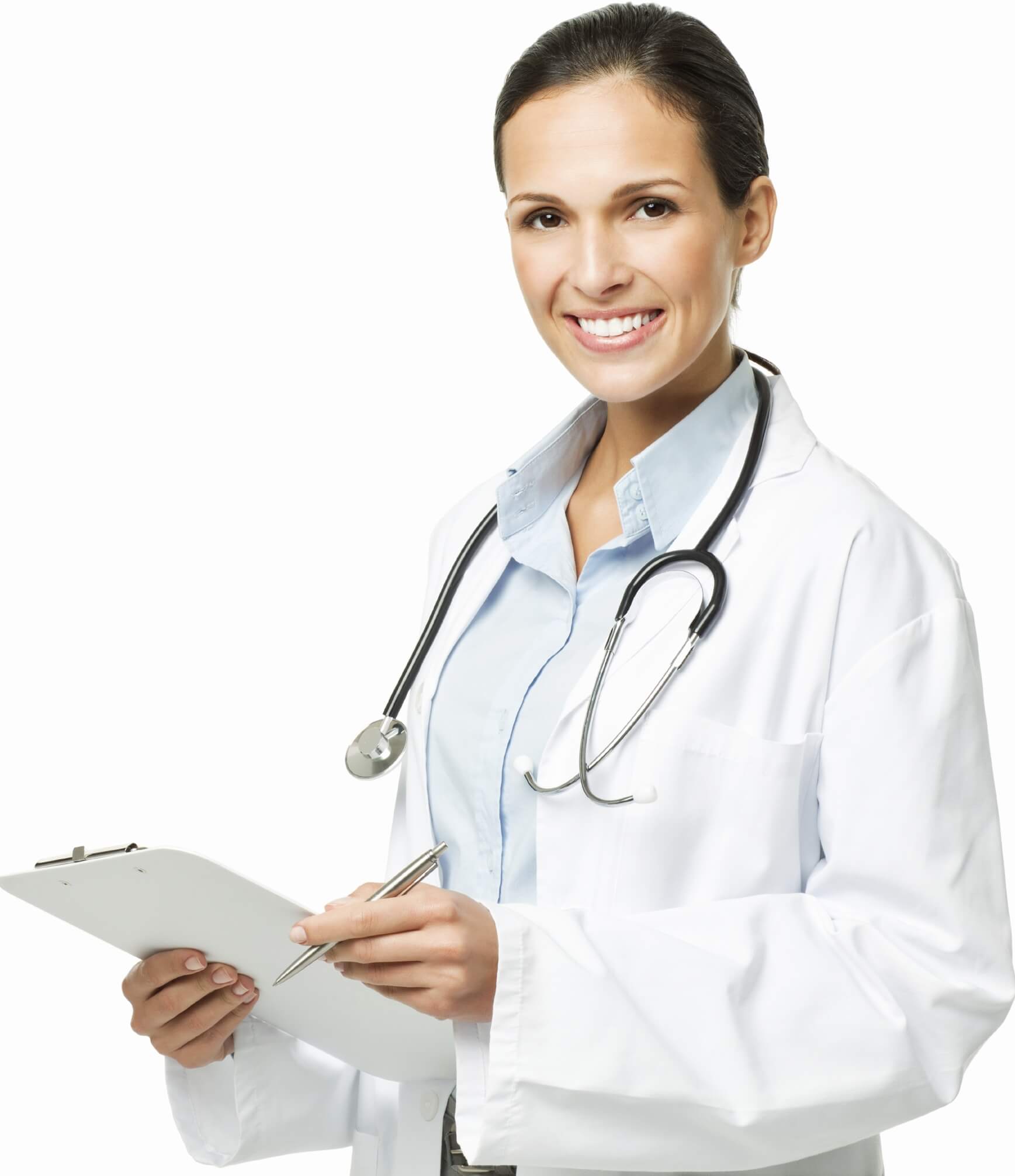 Image of a female physician with a clipboard and pen