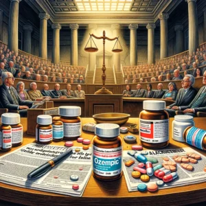 DALL·E 2024-03-01 12.50.23 – An illustration depicting the narrative of a major pharmaceutical controversy, focusing on the dual themes of medication for diabetes treatment and it By Tracy Liberatore ← Mass Torts to Watch: Lawsuits Against Weight Loss Drug, Ozempic